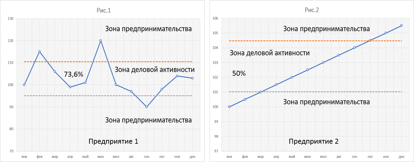 Конкурс мотивирует рост деловой активности – пребывание отношений в границах определенного качества, поэтому случайный акт экономической действительности (привилегию) бессмысленно отождествлять с прибылью или убытком. Так, деловая активность предприятия 1 (рис.1) в 1,47 раза выше предприятия 2 (рис.2), соответственно 1233*х0,736 предпочтительнее 1233*х0,5 (*параметры зоны деловой активности). Таким образом, победитель демонстрирует наибольшую деловую активность и оправданное освобождение от налога на прибыль в период предпринимательской деятельности; бизнес, находящийся в зоне предпринимательства с неразвитым результатом, также освобождается от обременительных налоговых платежей. Ограничением в данном случае может служить допустимый уровень вариабельности ведения бизнеса (до 33%).