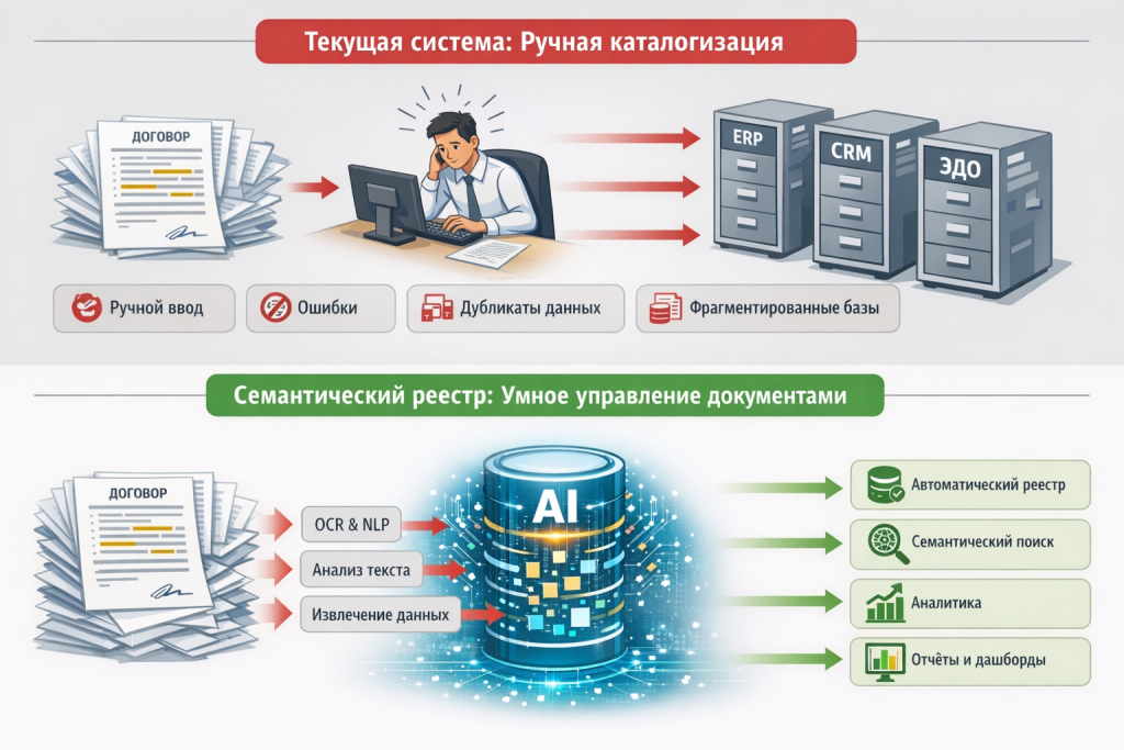 Большинство средних и крупных компаний прошли через волну цифровизации. Внедрены ERP-системы, развёрнуты электронные архивы, настроены CRM-платформы. Тем не менее в операционной практике воспроизводится один и тот же сценарий: сотрудник получает подписанный договор, открывает учётную систему и начинает вручную переносить в неё данные — наименование контрагента, сумму, сроки, реквизиты. Те самые данные, которые уже зафиксированы в документе. Это не частная проблема отдельной компании и не вопрос недостаточной автоматизации, а структурный изъян, встроенный в логику традиционных учётных систем: они проектировались под хранение атрибутов, а не под работу с содержанием. Разрыв между тем, что реально написано в договоре, и тем, что попадает в базу данных, – это и есть ключевая точка потерь: финансовых, временных, аналитических.